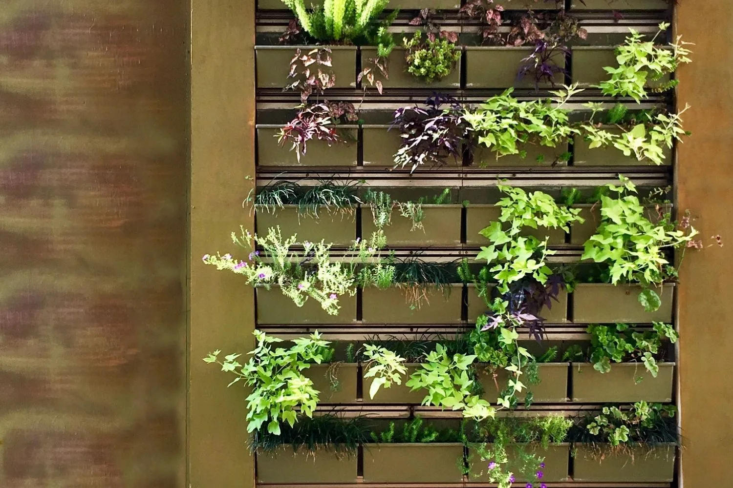 Flowers, vegetables and herbs can all be grown in a vertical garden, such as salad greens, baby kale, dwarf peas, bush beans, parsley, thyme, basil, and rosemary as well as edible flowers like pansies and calendula.