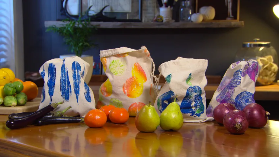 Make a totally terrific tote from your old plastic bags and sew simple calico bags for your fruit and veg.