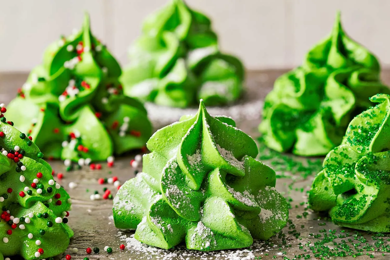 Follow Steps 1 and 2 of Meringue Santa Hats except beat in the same amount of green food colouring paste or gel.