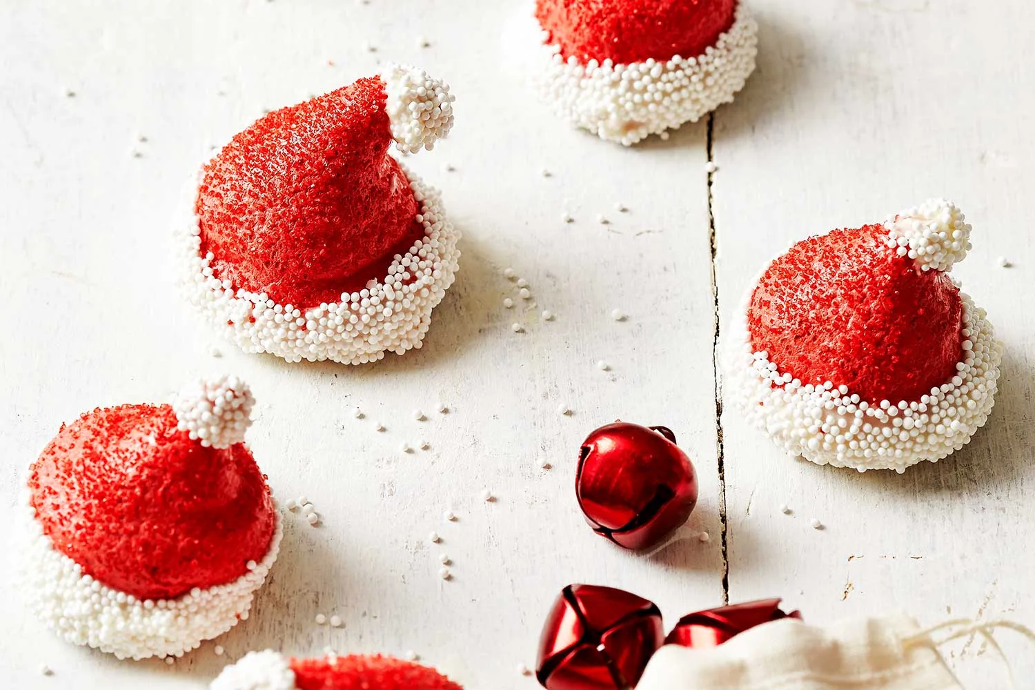 These adorable meringue Santa hats look great on a high tea stand, as a table decoration or even topped on a freshly iced cupcake. You can even dip the tops in edible glitter to add a little sparkle to the sweet little meringue Santa hats.