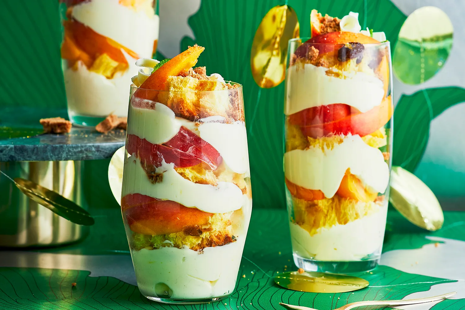 With layers of liqueur-soaked peaches and two-cheese cream, plus spiced biscuits and sweet bread, this trifle is one for the grown-ups. Top with white choc curls and mint leaves for a divine summer dessert. Dolce e delizioso!
