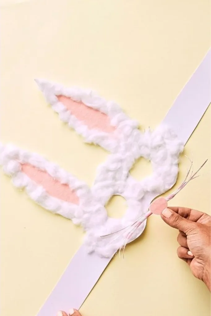 Attach cotton balls to the mask using wood glue (be sure to leave room for pink ears and nose!). Then add the pink ears, nose and whiskers and you’re done!