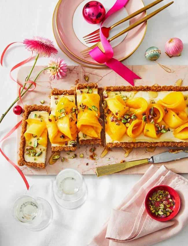 Spike cream cheese with honey to fill your gingerbread base, then top with mango and pistachios for a dreamy dessert to star on your table.