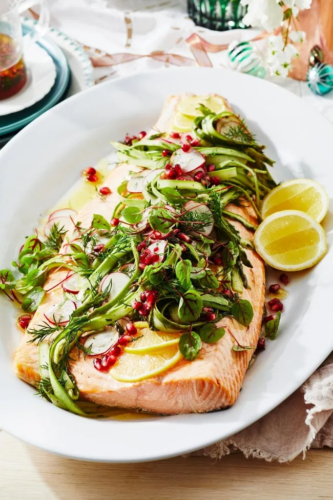 For your next dinner party, use up all of your asparagus bunches with a side of salmon. Roast in the oven and top with crunchy, bright vegies.