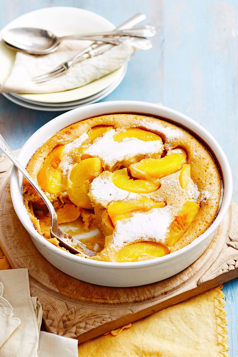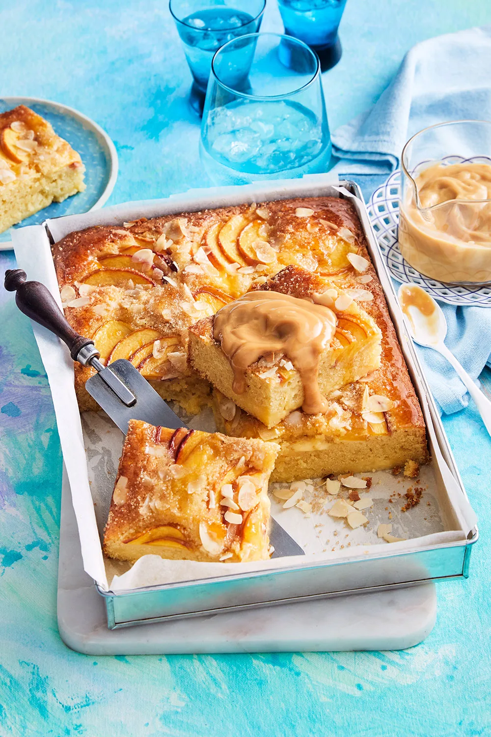 Have a potluck coming up? This peach tray bake with caramel custard is the perfect dessert to bring that’ll definitely impress. Depending on your mood (and the weather), you can serve warm or cold.