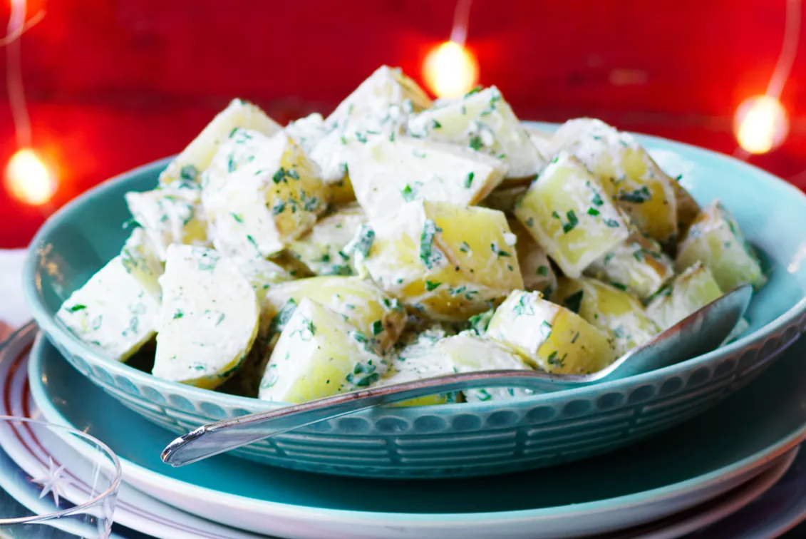- Add the mayonnaise to the potatoes and toss to combine.