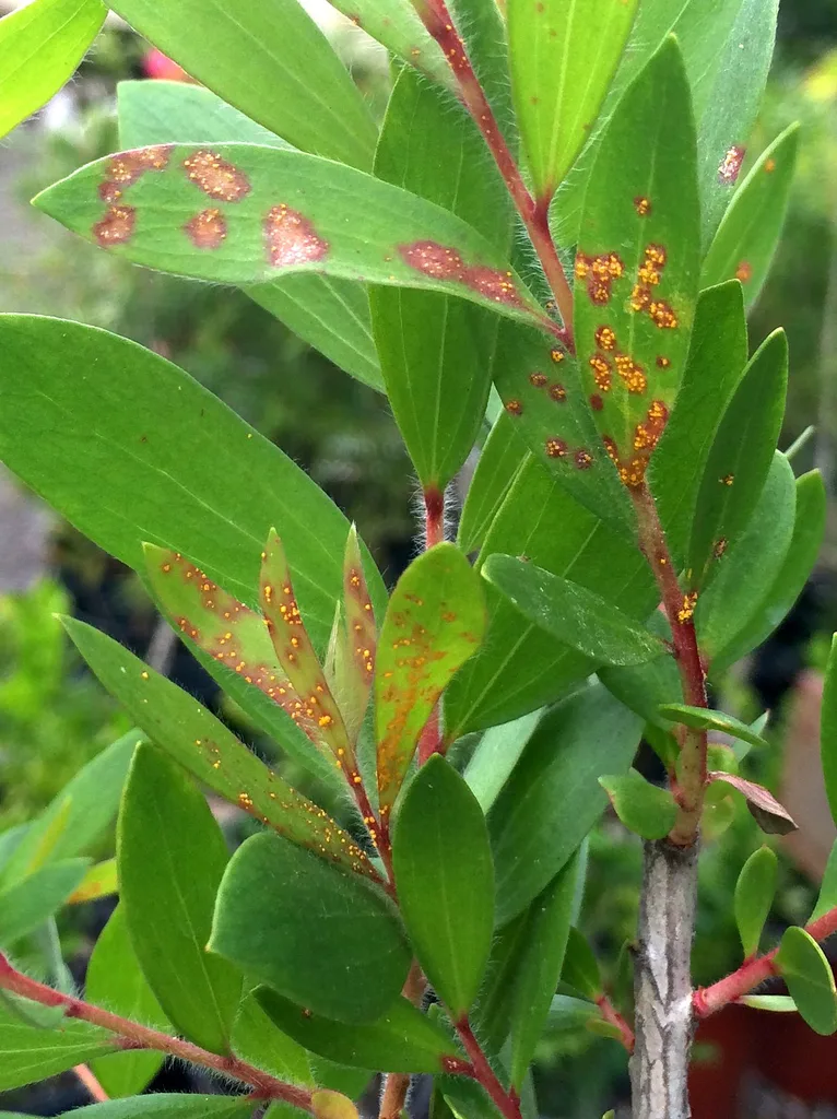 Plants that are affected by myrtle rust fungal disease will have yellow spores, stunted growth, defoliation and can end up dead from the infection. The Myrtaceae family in Australia (both native and non-native), is the most affected, including: