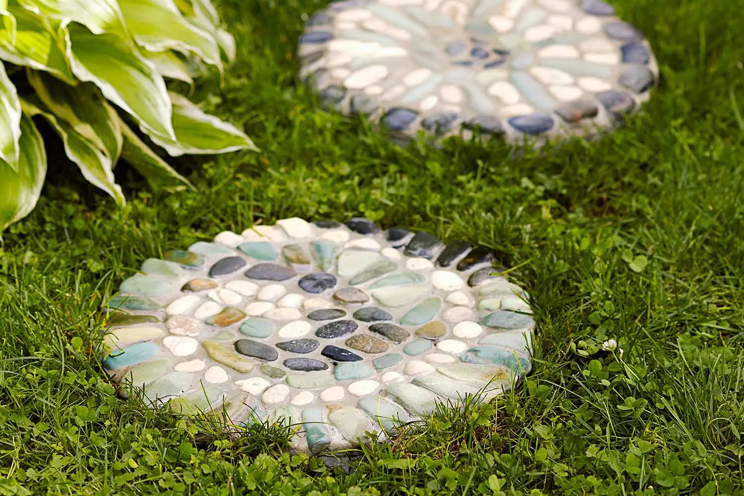 Transform ready-made concrete pavers into mosaic stepping stones using pebbles.