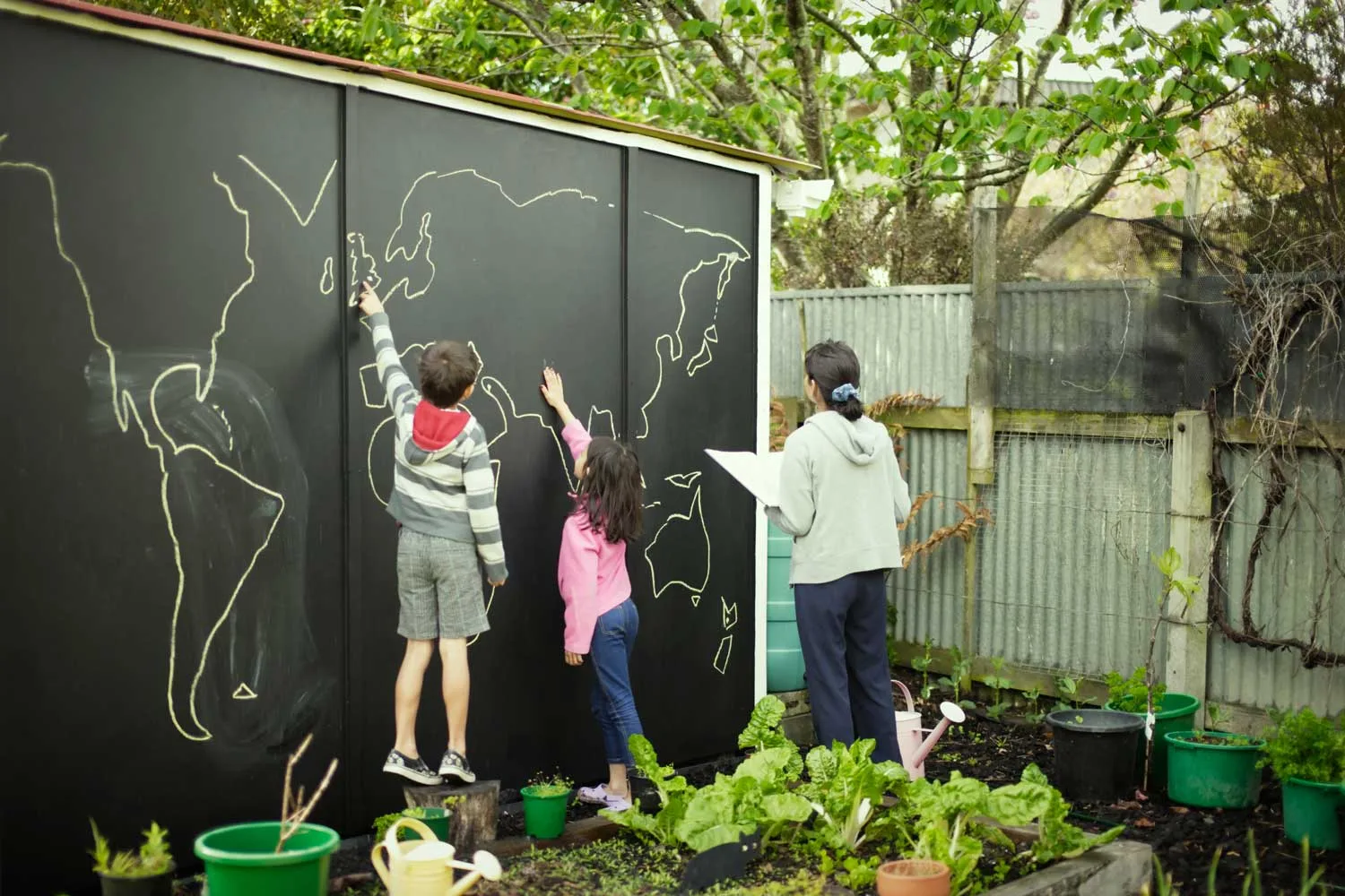Create a canvas for the kids to show off their artistic talents by painting one side of the shed or undercover wall in chalkboard paint (as pictured above). Just make sure the surface is clean and dry, apply primer then coat with chalkboard paint. Keep a caddy well stocked with chalk in a variety of colours — ready for art time! Psst… Wash the chalk away with water and a soft cloth.