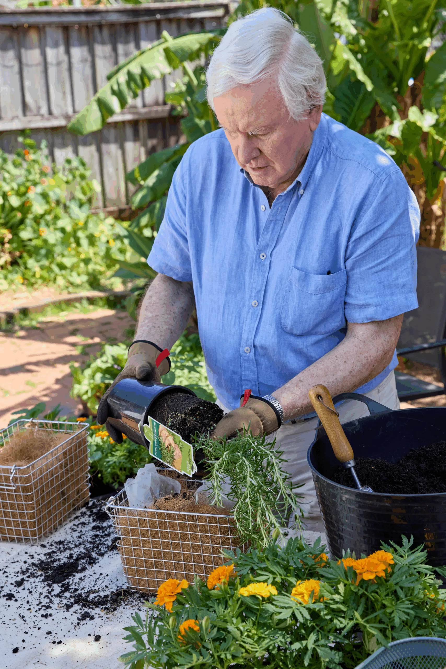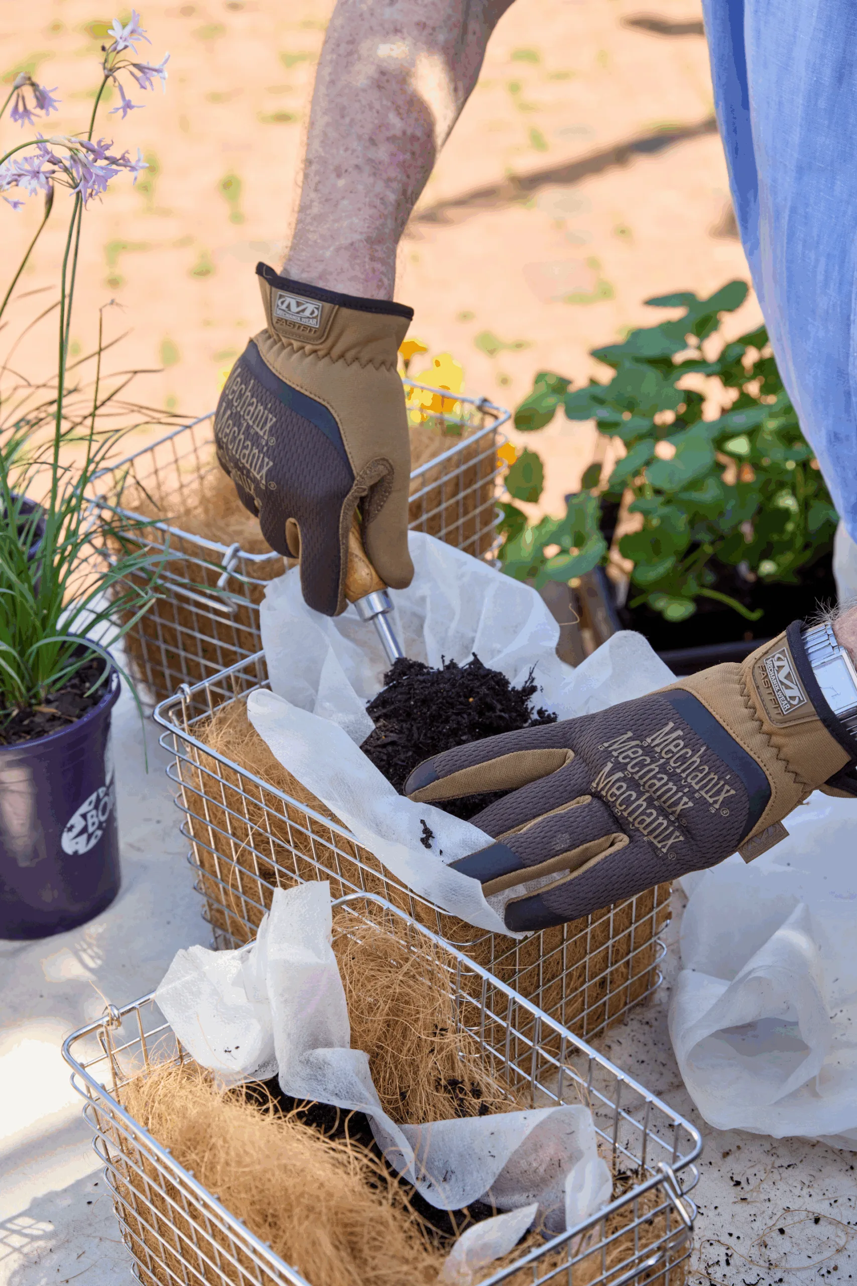 Fill baskets with potting mix using a trowel.