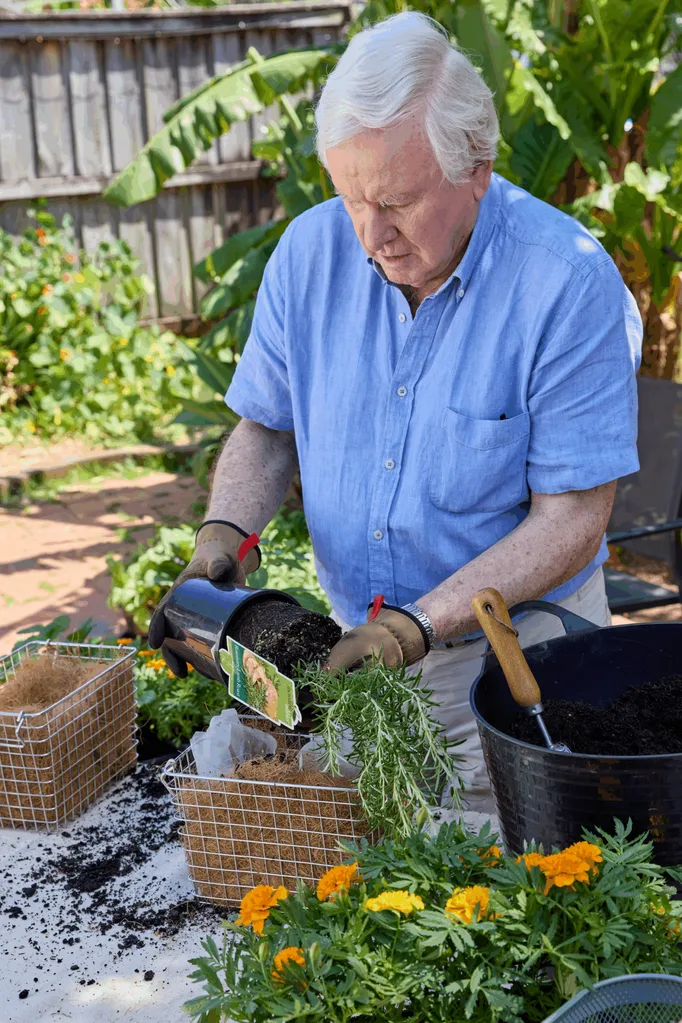 Remove plants from growing containers, create wells in potting mix and put in plants. Press down mix gently.