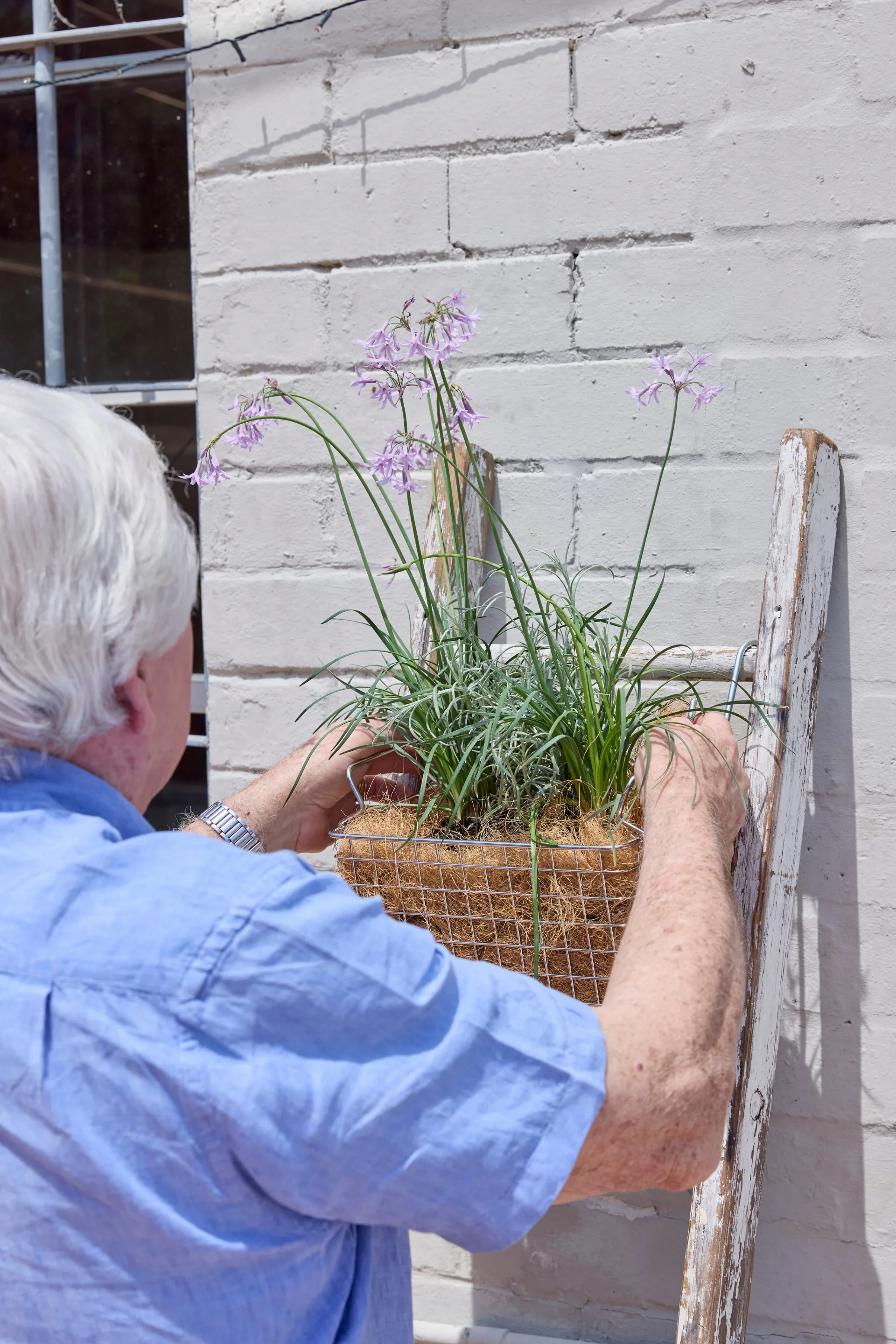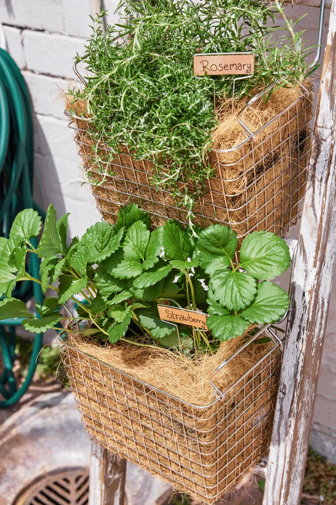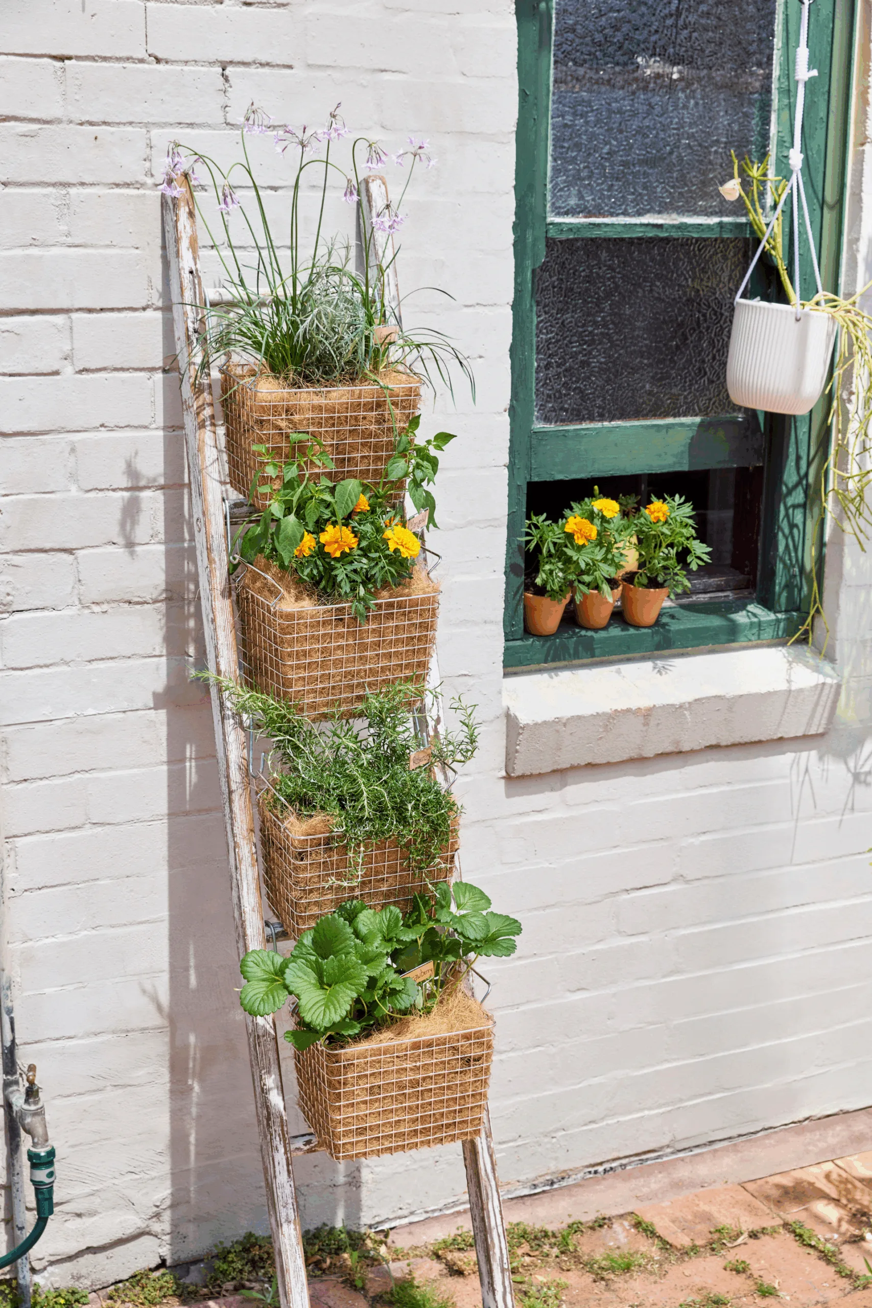 Attach baskets to ladder with S hooks. Water.