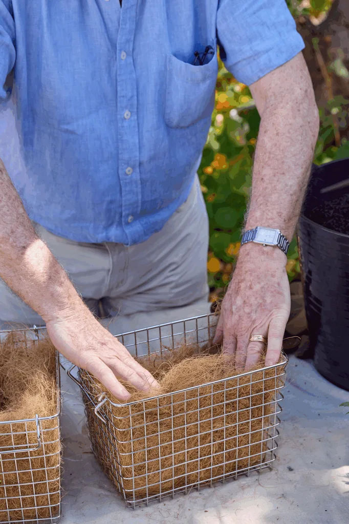 Tease the coir brick apart and line the baskets.