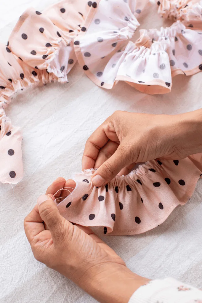 Cut a strip of fabric twice that measurement in length and about 9cm wide. If your fabric isn’t long enough you can do the ruffle in sections and sew it together.