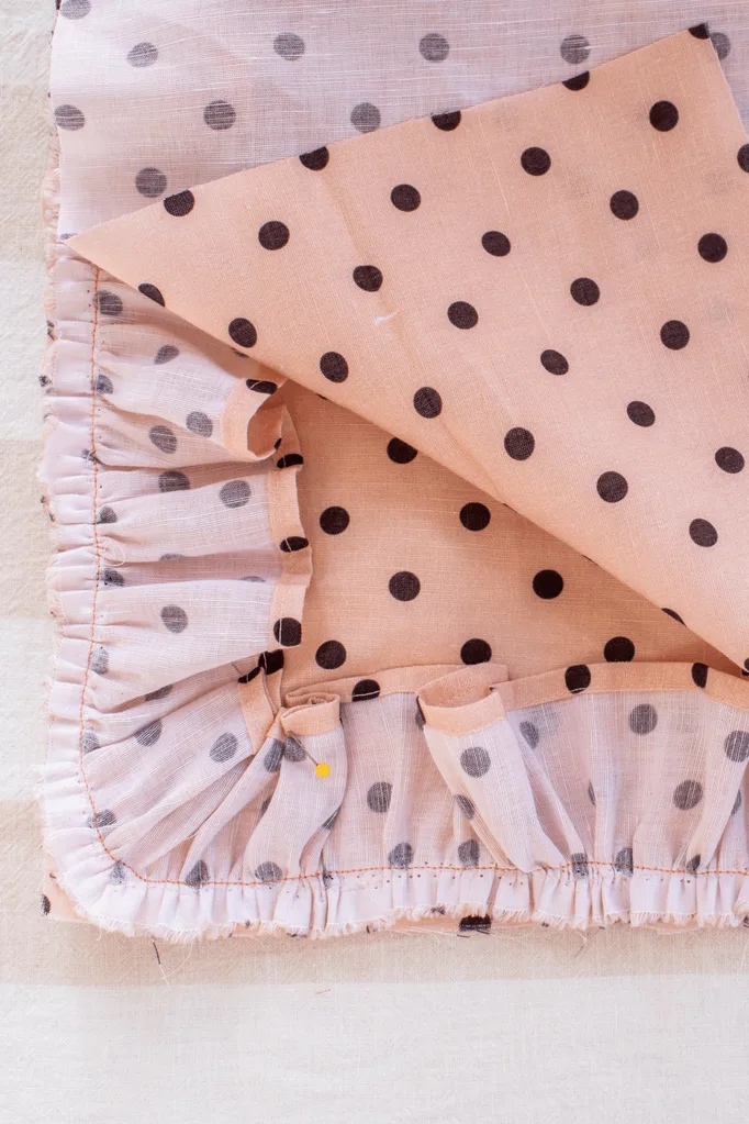 Place the second rectangle right-side down on top of the first piece, so that the ruffle is in between. Pin or clip around all edges, ensuring everything is neatly aligned.
