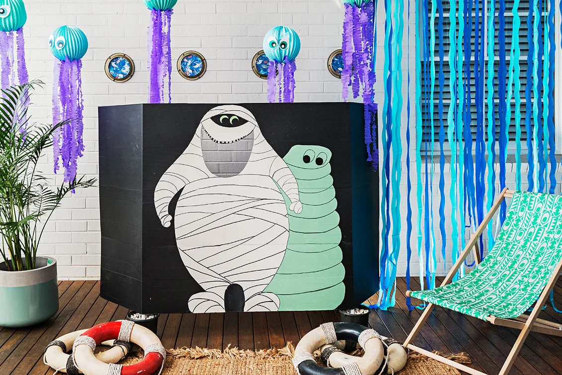 STEP 5 Cut out the mouth with a utility knife. Secure broom or mop handles to inside corners with cloth tape and sit in pebble-filled buckets to stabilise booth.