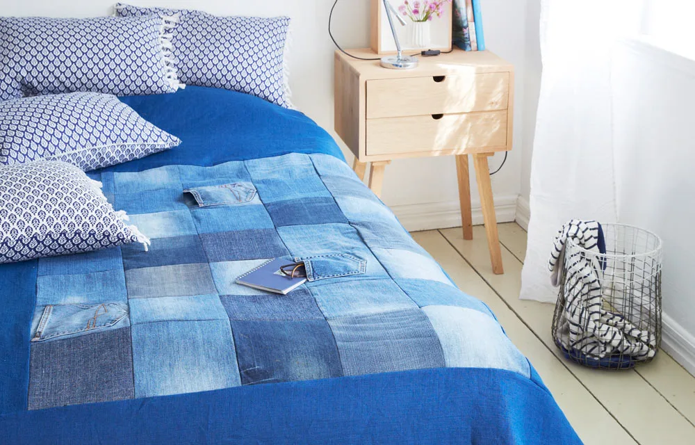 Quicker and easier than a quilt, a bedspread, which has no filling, is as simple as cutting denim into squares and stitching them together. Then, surround the sewn ‘centre’ with panels of linen. Hem the sides and your bedroom rhapsody in blue is ready. Want it bigger? Add extra denim squares or make the panels larger to adjust your spread to any bed.