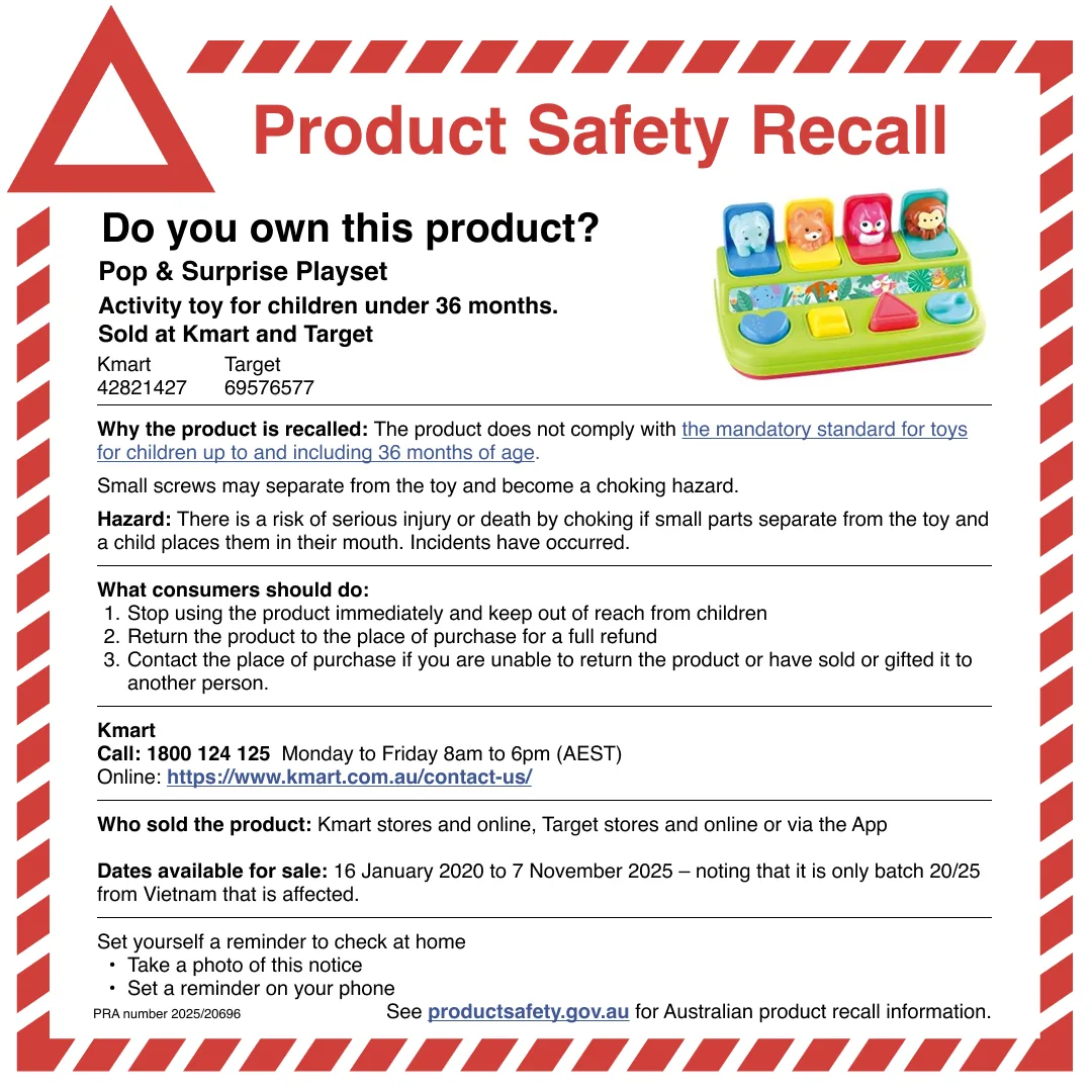 The Pop and Surprise Playset has been sold across Australia in recent months, and while the recall affects a specific manufacturing batch, parents and caregivers are being urged to check their toys immediately.