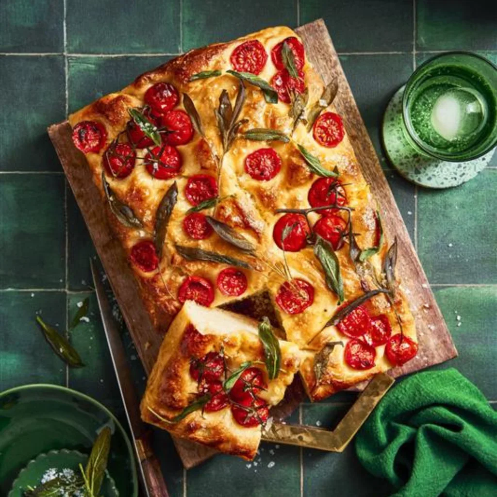 Preheat oven to 240°C/220°C fan-forced. With oiled hands, press dimples in the dough, then press in sage and tomatoes. Drizzle with 2 tablespoons oil. Sprinkle over sea-salt flakes. Bake 25–30 minutes, until golden and cooked. Drizzle with remaining oil. Cool in pan 10–15 minutes, then transfer to a rack. Serve warm or at room temperature.