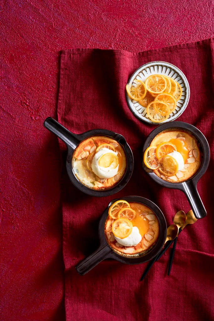 Divide mixture among dishes, then sprinkle with flaked almonds. Place roasting pan in oven. Carefully pour boiling water into the base of the tin until it comes halfway up the sides of the dishes. Bake for 20–25 minutes, until puddings are just golden and wobble slightly. Transfer dishes to a plate. Serve immediately, topped with lemon curd, whipped cream or ice cream and candied lemon.