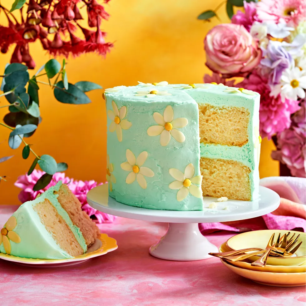 Trim tops of cakes slightly to remove icing. Place one cake on a cake stand and dollop with about one-quarter of the buttercream. Top with remaining cake. Spread top and sides with remaining buttercream.