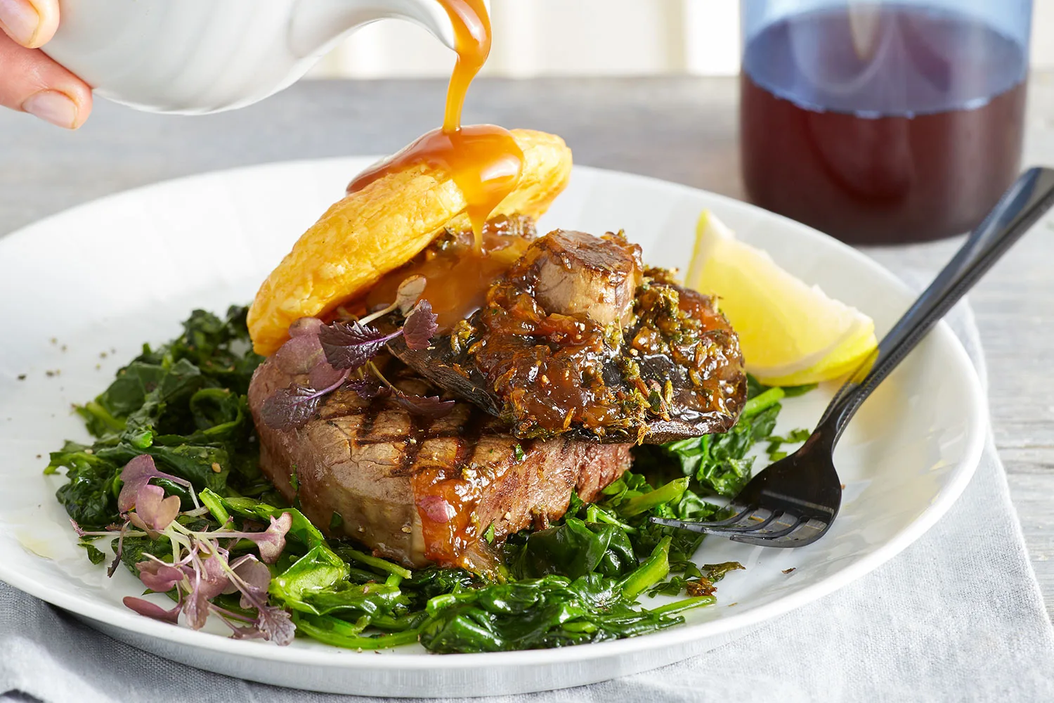 Pile spinach mixture onto serving plates, then top with steaks, mushrooms, onion jam and pastry discs. Serve with red wine gravy, lemon wedges and micro herbs.Â