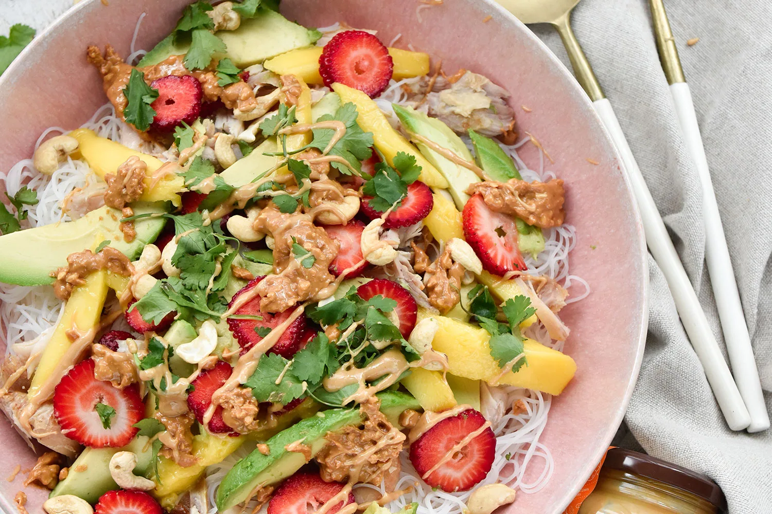Place the noodles into a large salad bowl. Top with chicken, followed by the mango, strawberries, avocado and cashews. Pour the vermicelli noodle sauce over the salad and then dollop Mayver’s Crunchy Peanut Butter on the top.