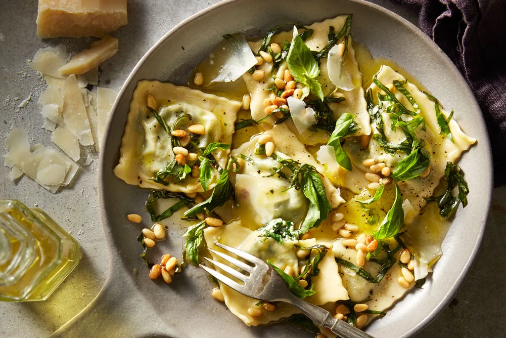 Spoon ravioli onto serving plates. Sprinkle over toasted pine nuts, the extra basil and the extra parmesan. Season with black pepper and serve.