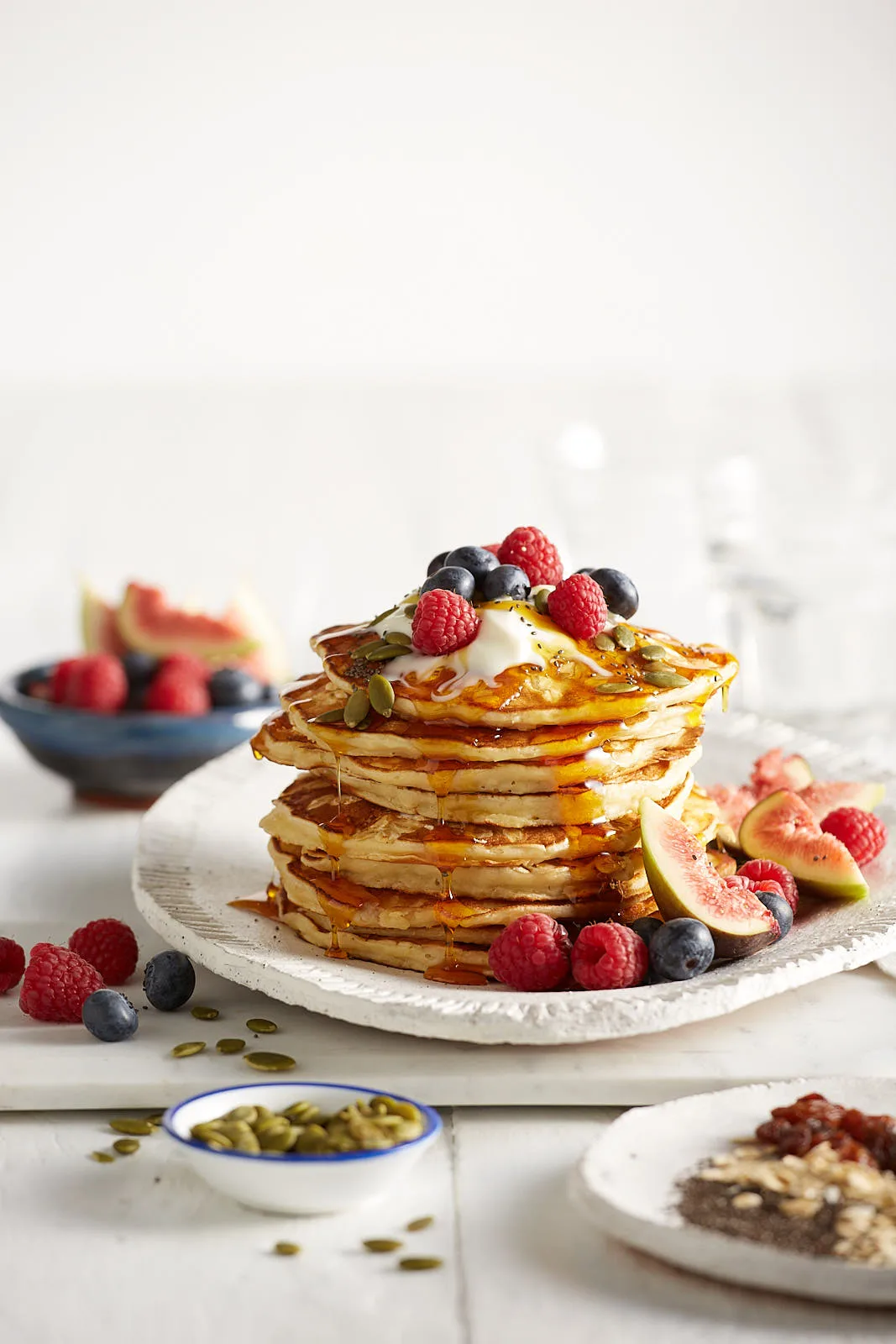 To serve, stack pancakes on plates. Drizzle with maple syrup or honey. Top with yoghurt and serve with berries, figs, and pumpkin seeds.