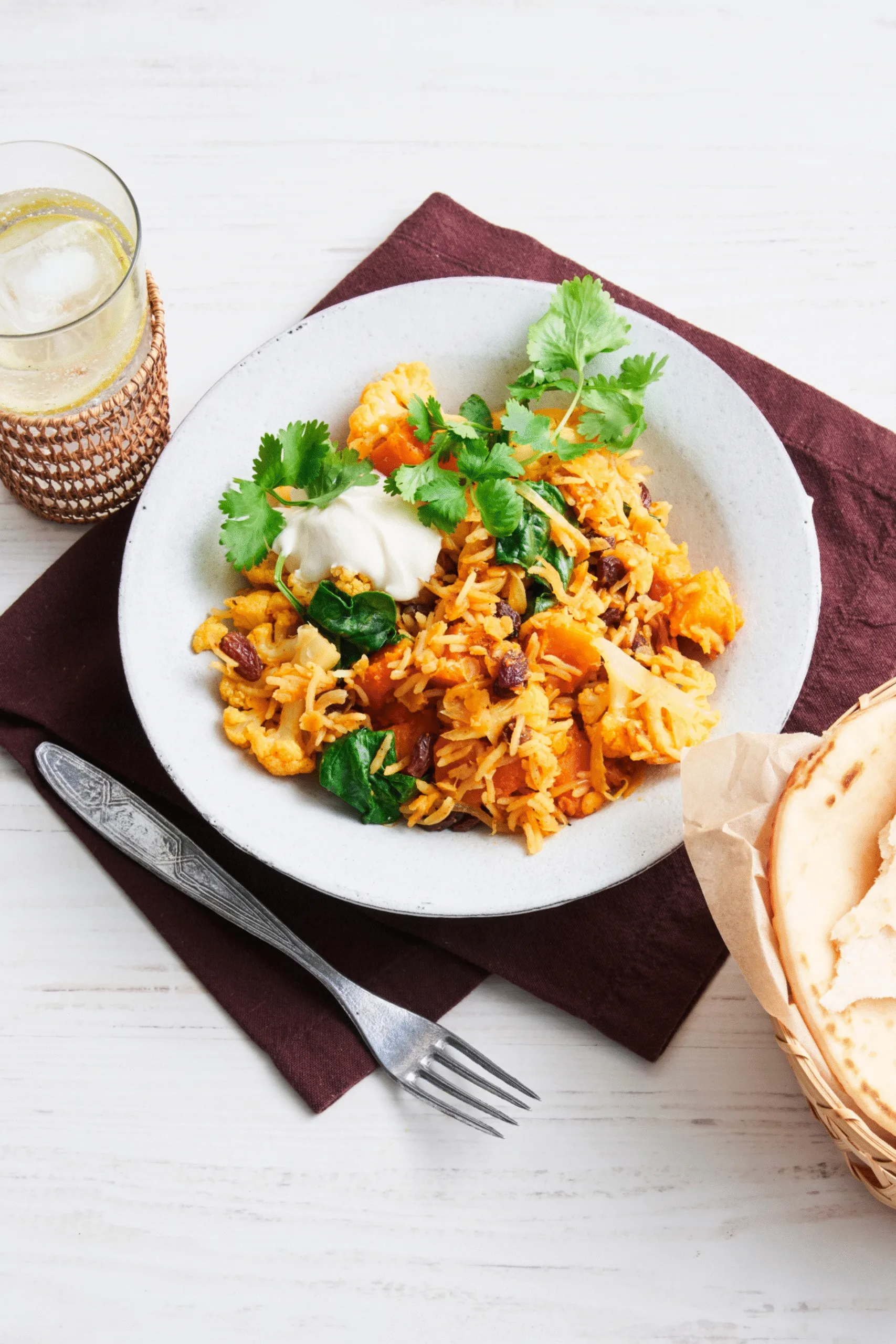 Just before serving stir in spinach and set aside 1 minute until wilted. Serve with yoghurt, coriander and torn naan bread.