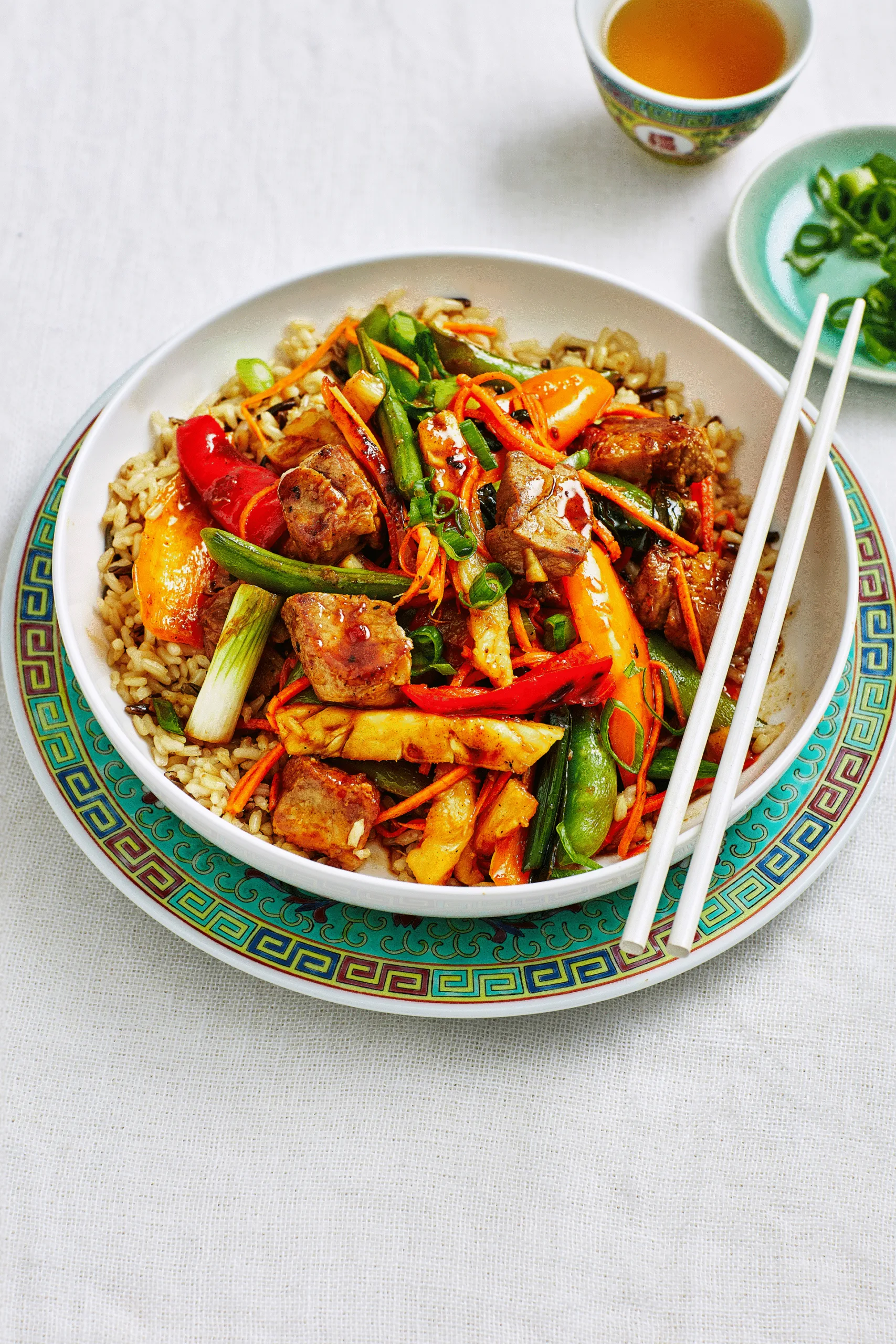 Add pork, sauce and pineapple to the wok. Stir-fry 2 minutes until sauce simmers. Toss carrot through. Serve with rice. Sprinkle on green onion garnish.