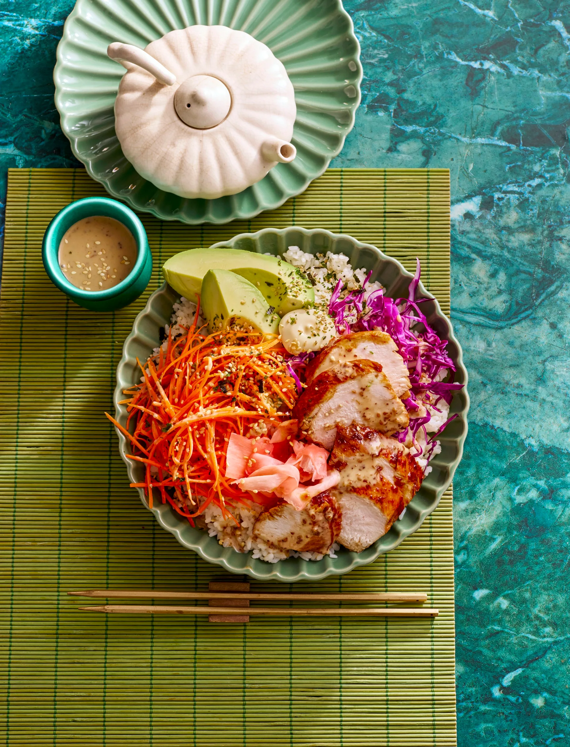 Spoon rice into four serving bowls. Add carrot, cabbage and avocado. Add chicken and spoon over teriyaki sauce from the pan. Serve with sesame dressing, furikake and ginger.