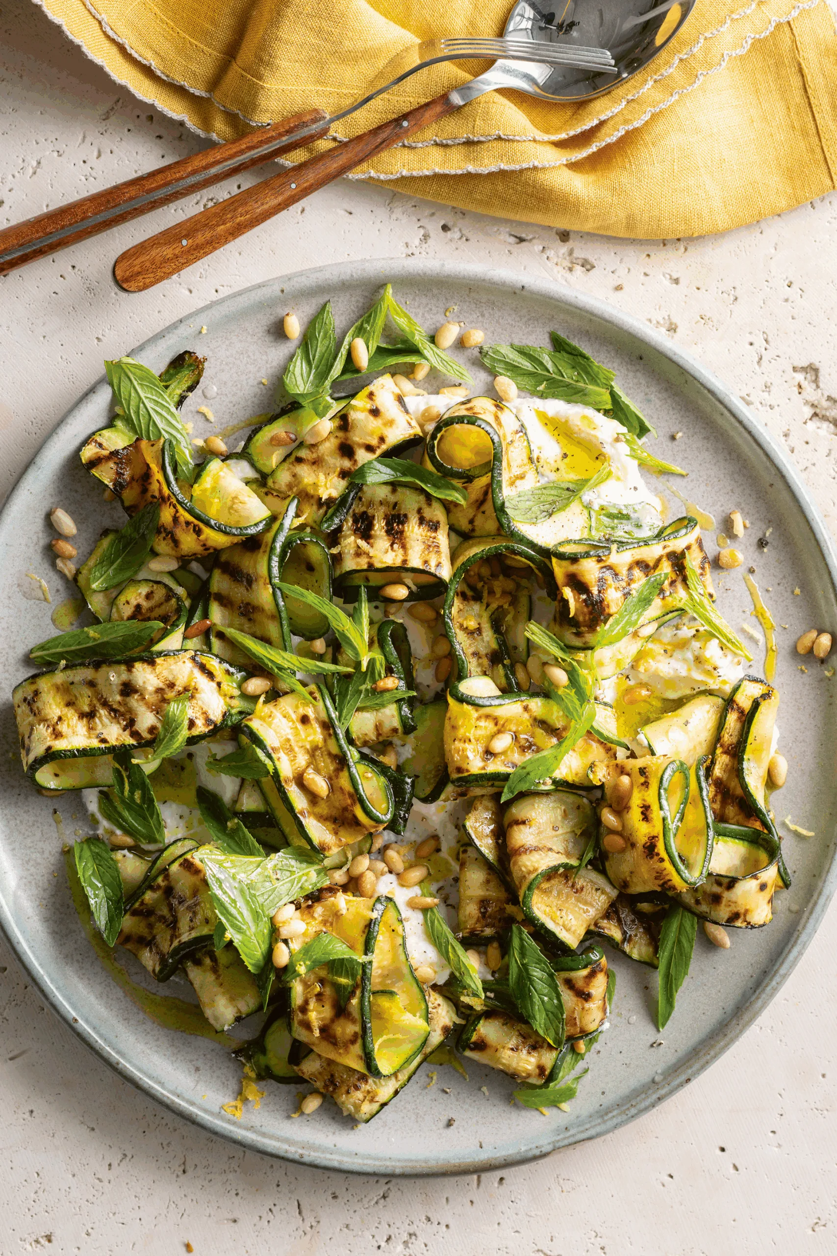 This is one of those minimum-effort, maximum-impact salads that are quick to pull together. The whipped lemon ricotta can be made in advance so that, on the day, all you need to do is grill the zucchini. The combination of the zucchini and mint with the lemony ricotta is perfect.