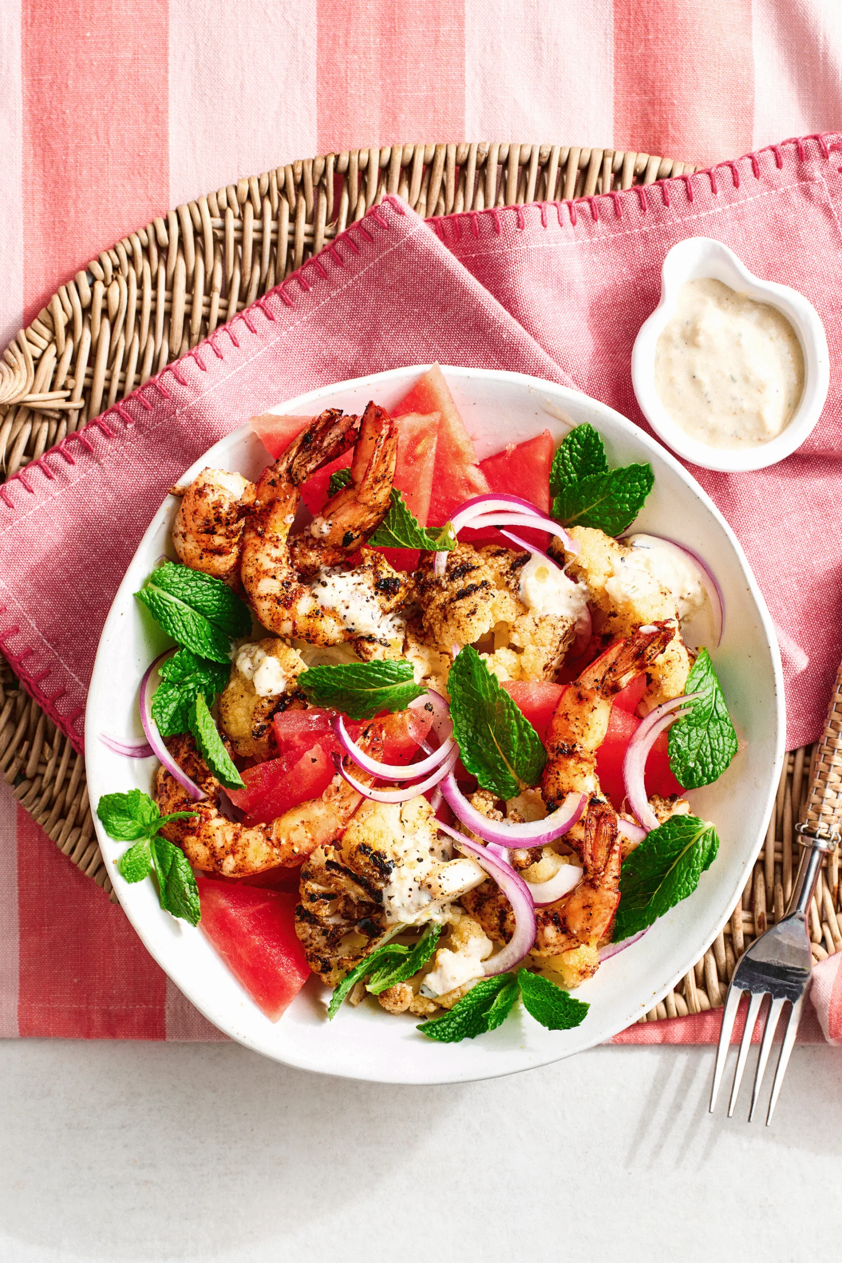 Make a dressing by combining the baba ganoush, yoghurt and lemon juice. In a bowl, mix the cauliflower, prawns, watermelon, mint and onion. Serve with baba ganoush dressing.