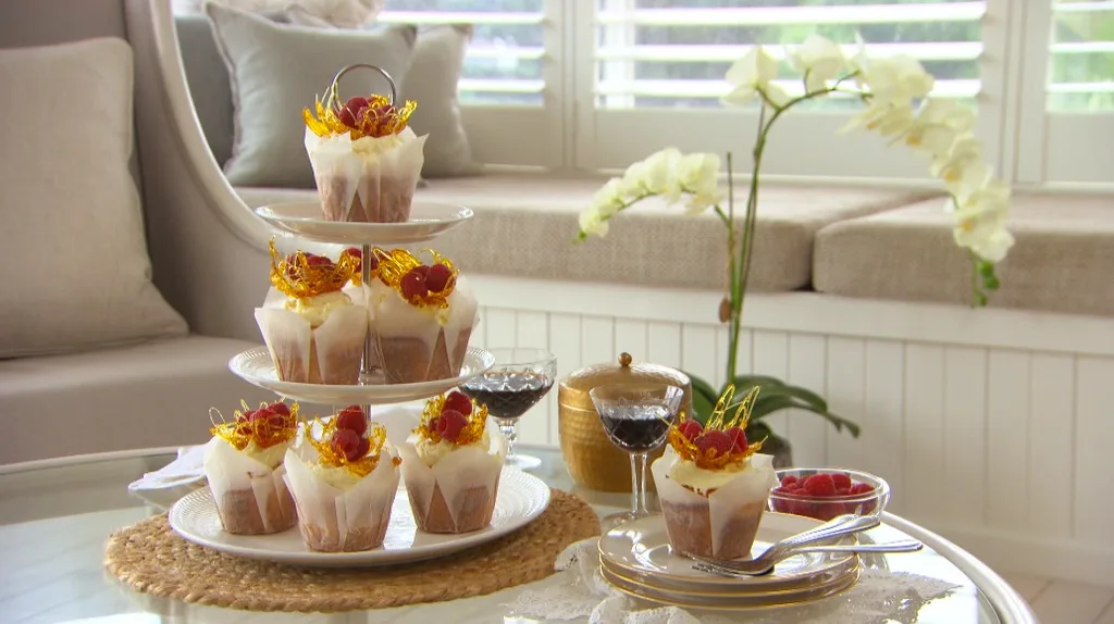 Place a crown on top of each cake and put raspberries in the middle. Decorate with gold glitter.