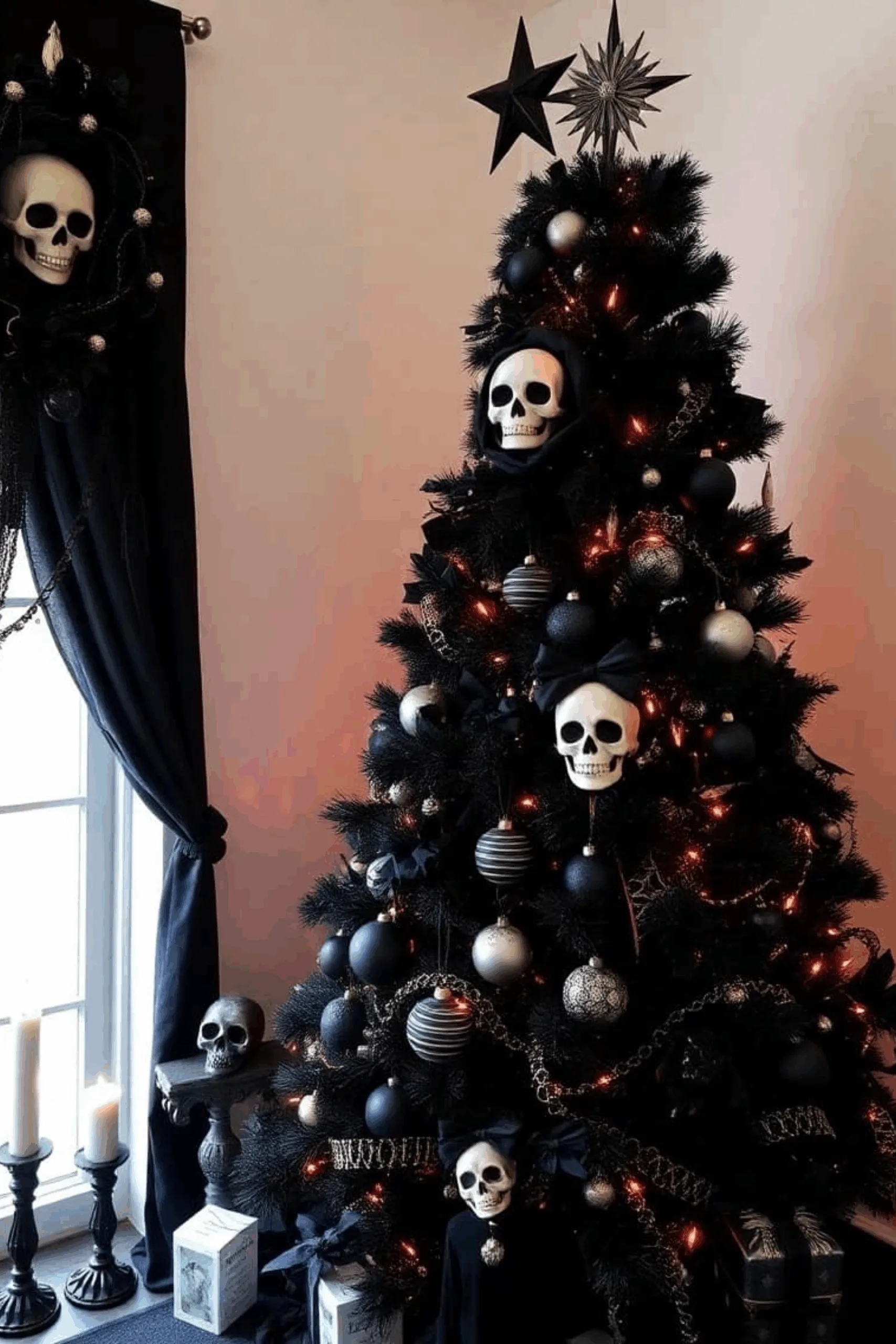 Lean into the spookiness of it all with gothic-inspired decorations. Think mini skulls, faux black roses, black and silver baubles, and eerie red fairy lights. Swap the scratchy tinsel for some shiny white pearls, and don’t forget to top it with a black star too.